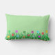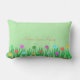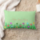 Hem söta hem blommor och gröna gräsplantor på ljusgrön ländryggs kastkudde. Texten på framsidan kan anpassas. En fin present till alla!