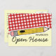 Ett postkort med en design framtill bestående av rött gingham och en gul penna. Texten lyder "PÅMINNELSE: Öppet hus." Anpassa baksidan med detaljer om din händelse.