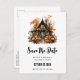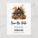 Spara vykortet för datum med en coola- och skämtbild av ett hemligt hus av trä. Omgiven av stora pumpor i orange och träd med orange löv. Windows med orange ljus lägger till en fin glöd. Roligt Halloween-design.
