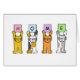 Fyra tecknader katt som håller upp olika färgad brev med texten "HEM".