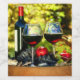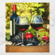 Två eleganta vinglas fyllda med rik rödvin står bredvid en flaska omgiven av frodiga frukter.