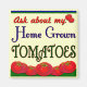 Fråga om mina hemodlade tomater. En vintage ser ut som retro tomato-reklamskylt för trädgårdsmästare och tomatsnober. Lustigt ord och gåvor från trädgårdsmästare.