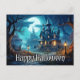 Det här unika vykortet har en hemsökt mansion i månljuset. Var vänlig och lägg till din egen unika text och adress på baksidan av vykortet Happy halloween.