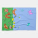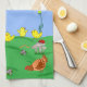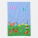 Hens and chicks running around the farmyard with butterflies and toadstools.