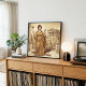 Hera, den majestätiska drottningen av de Olympiska gudarna, avbildas här stående framför de antika grekiska templen, åtföljd av sin heliga påfågel. Hera är vördad som gudinnan för äktenskap, familj och kunglig makt och representerar värdighet, styrka och den bestående kraften hos den gudomliga suveräniteten.
