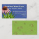 Örter affärskort-mall. För herbalisten, odlaren, den naturliga läkaren eller apoteksbutiksägaren, anpassa sig till namn i affärsvärlden, namn och mycket annat. En rosa (echinacea purpurea) och en grönt aloe vera fabrik dekorerar den lämnat sidan. Mindre text justeras mot högerna, för adress, närvaro av online och kontaktinformation. Fetstilt utskriven text överst för företaget namn. Texten är benvit över en lila-blå bakgrund. Ett ljus mönster av blommor och bin på ryggen finns över en grönt färg.