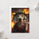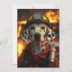En modig Dalmatisk hund klädd som brandman och står framför en brinnande scen med gnistor som flyger. Hund bär en brandhjälm och skyddshjälp, symboliserar mod och hjältemod.