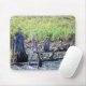 Ett foto av en Underbar blå Heron som går tvärs över en damm genom fallna träd-trunkar och grenar. Träd står fortfarande där gången i träd växte till tillväxthöjder för länge sedan. Nu är träd bara som sittplatser för fåglarna. Dammens yta är täckt med vatten liljor. Dammen omges av gröntar, som gräns är en ängsmark. Fotografier Copyright ©2021 Kimberly J Tilley.