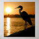 En heron står på stranden som är silhuetterad mot en blixtsolnedgång.