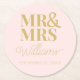 Herr Fru Elegant Repetition Förlovningsfest Klassisk Rund Pappersunderlägg. Anpassa mallen med ditt efternamn och datum för din bröllop, förlovning eller årsdag. Perfekt för repetitionen middag, förlovningsfest eller bröllopsmottagning. Kommer i rosa, svart, vit, guld och bruna alternativ.