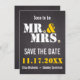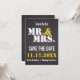 Herr och fru Modern typografi svart, gul kritskrifts bröllopsinbjudan "Spara datumet" med titlarna herr och fru i vitt, et-tecknet i gult och punkten i vitt med ett gult hjärta i. Denna moderna, eleganta och samtida bröllopsmall har en vintage lantlig touch. Den är rolig och trendig och ingår i en komplett anpassningsbar bröllopssamling perfekt för ett vinterbröllop.