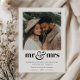 Det här julkortet är designat för nygifta som firar sin första jul som gifta, och kombinerar modern enkelhet med säsongens charm. Det har ett fyrkantigt foto som du kan ladda upp för att visa din favoritminne tillsammans. Frasen "mr & mrs" i en djärv typografisk design åtföljs av ett delikat hjärta bredvid. Under det visas dina personliga julönskningar elegant i två kompletterande teckensnitt, tillsammans med året längst ner, vilket skapar en tidlös souvenir.