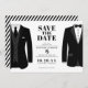 Låt alla veta att ni två har bestämt ett datum för er bröllopsdag med detta moderna "save the date"-kort med två svarta kostymer. Personalisera genom att lägga till era namn, datum och bröllopsplats.