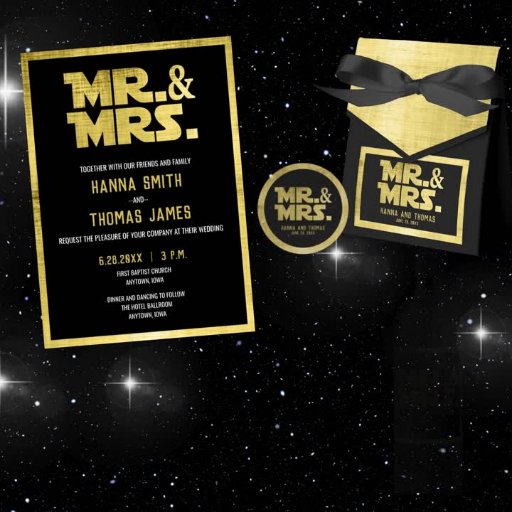 Ignorera förväntan för ditt kosmiska firande med vårt Sci-Fi Geek Thned Bröllop spara datum. Spelandet i svart och guld, med "Mr and Mrs" i en futuristiska, är en förhandsvisning av äventyr till kom. Bevara datumet och gå med oss på en resa genom kärlek och galaxer långt bort.