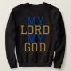 Den här tröjan visningar ord "Min Gud Gud" i ett fet utskrift med blått och gyllene färgad brev i ett typograftema stil och ett trosbaserat tema. Den här tröjan är gjord av 100 % bomull. Den här skjortan är både plussad och hållbar, vilket gör att en underbar kombination har mindre matchande bild på baksidan.