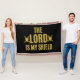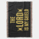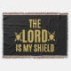 Kasta filten har ett fet stil i antonio-stil med guldfärgad färgad brev som visar den bibliska frasen "The Lord Is My Shield" med ett svärd och en sköljikon på vardera sidan i detta bibliska ordspråk. Denna Blankett tillverkas med 75% bomull och 25% polyester med en mycket mjuk hand som tvättar att rekommendera.