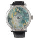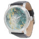 Herrklocka Teal Guld Marmor-Look – Svart Läder Armbandsur