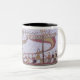 Franska skolans hertig William och hans flotta korsar kanalisera till Pevensey, från den Bayeux tapestryen, för 1082 (ullbroderi på linne) som lokaliseras på Museen de la Tapisserie, Bayeux, frankrike. Hertigen William och hans flotta korsar kanalisera till Pevensey, från den Bayeux tapestryen, för 1082 (ullbroderi på linne) skapades runt om det 11th århundradet.
