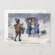 Ett vackert tyskt nyårskort från vintage som visar tre små flickor som är varma mot att en vän träffas i snö, en liten pojke som bär en basket av kråkor. Den lilla pojken har en ung gris som går med honom.