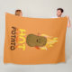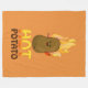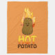 Rolig tecknad brun potatis med ett stort lyckligt leende, prickar för ögon och pinnar för armar. Han är omgiven av gula och orangea heta brinnande flammor. Nedanför honom i orange och gul text står ordet HET och nedanför det i brun text står ordet POTATIS. Rolig udda design för ett skratt.