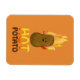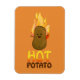 Rolig tecknad brun potatis med ett stort lyckligt leende, prickar för ögon och pinnar för armar. Han är omgiven av gula och orangea heta brinnande flammor. Nedanför honom i orange och gul text står ordet HOT och nedanför det i brun text står ordet POTATO. Rolig och udda design för ett skratt.