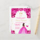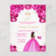 Denna eleganta och glamourösa födelsedagsfestinbjudan visar en vacker prinsessa med mörk hy i en hetrosa klänning. Texten kombinerar handskriven skrift och moderna sans serif-typsnitt för en klassisk och sofistikerad look. De blomsterarrangemang, fjärilar och gyllene konfetti skapar den perfekta blandningen av rustik och chic.