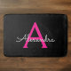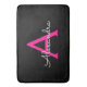 Svarta och heta rosa enkla script monogram namn badmattor. Detta gör den perfekta examen, födelsedag, bröllop, brud shower, årsdag, baby shower eller möhippa present för någon som älskar glamour lyx och chic stilar.