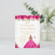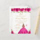 Denna eleganta och glamourösa födelsedagsfestinbjudan visar en vacker prinsessa med blont hår och ljus hy i en hetrosa baljklänning. Texten kombinerar handskriven script och moderna sans serif-typsnitt för en klassisk och sofistikerad look. De blomsterarrangemang, fjärilar och gyllene konfetti skapar den perfekta blandningen av rustik och chic.