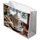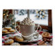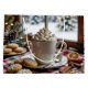 Vacker julklapp i säsong med en illustration av choklad i hett, sockerkakor, torkade orangar, kanel och Julgran utanför vintern.