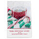 En presentväska med en varm och bekväm julfoto. En hett kopp av kakao med marshmallow i en söt röd och vit polka punkt mugg. En strimlad candy cane som vilar på en grönt och en vit strimlad scarf täckt i snö. En varm drink efter att ha kommit in från kallet träffar verkligen. Ett festligt helgdag-foto. Varm Önskemål skriven i ett enkelt men klassiskt modernt typsnitt. Bakgrunden är vit på vit snöflinga mönster.
