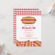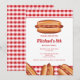 Desteis snabbmatsillustration av en hett hund bun med en grillad korv som har lite ketchup och senap överst. Bakgrunden har en röd gingham mönster. Anpassa texten med information om händelsen.