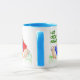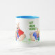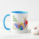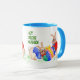 En säker mikrovågsugn och diskmaskin 11 oz vit ringsignal mugg med pulverblå fälg och handtag. Utformningen är av två "Hett Kor Bunnies" som försöker hiss ett tungt Påskägg. Se även matcha hälsningskort.