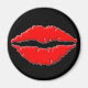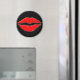 En rund magnet med kvinnans läpptryck på svart bakgrund.