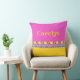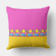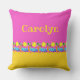 Den stiliserade mönster på en fyrkantig kudde har en frys utmed grund för att fira strandliv, med solsken, handflatan träd, blått hav och guldsand. Utformningen kompletteras av färg block av gult med stark rosa och solsken. Den ena sidan kan vara personlig med ditt namn. Bilden är en originell, unik, hand plockade-stiliserad teckning, digitalt färgad.