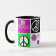 Våra T-tröja för designen för hettfärgfred, tote bags, mousepads, knäppas, magneter, och annan grönt för limefrukt för objektsärdraghett, svarten, och shock rosablommor och fredsymboler och ett meddelande för att främja världsfred!