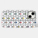Det här telefonfodralet har en modernt design i mitten av århundradet som består av hexagoner som är fastkedjade tillsammans med en cirkel på en peg inuti varje.