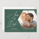 Det här moderna fotot spara datum meddelande har en sexkantig bild ram på en dammig grönt bakgrund. Designen accentueras med skript för elegant och anpassningsbar för datum, namn och plats för bröllop. Med hjälp av tilläggstext på baksidan kan du lägga till mer information om bröllop.