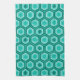 Traditionell japansk kimono-handduk för tryckte - kapsling av hexagon med en central blommotif i djup turkos/teal, vitt och lätt akvarium på en medelhög turkobakgrund