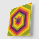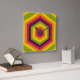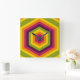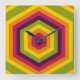 This wall clock features a bold, geometric design built from concentric hexagons in a repeating sequence of vibrant colors (yellow, orange, red, magenta, and olive green). The hexagons grow in size toward the edges of the image, creating a striking sense of depth and a hypnotic visual effect reminiscent of both modern digital art and retro patterns.