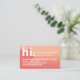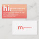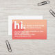 Gör ett underbart första intryck och presentera dig för potentiella kunder med våra "hi my namn is"-affärskort. Designen har "hi" i en modern typografisk design med en diagonal textskugga. Korallövertoning i snyggt ger ett modernt, fetstilt utseende. Anpassa med namn, titel och kontaktinformation. Den omvända sidan är designad i rent, minimalt stil med personlig monogram och social medieferens.