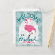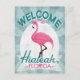 Hialeah Florida rosa flamingo. I vintage resemål posters stil, står det "Välkommen till Hialeah, Florida" i rosa, vitt och mintgrönt turkos.