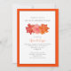 Inbjudan till möhippa av orange med söt hibiscus blommor design. Plattformskort med lager med provtext som innehåller typen party (möhippa, jack och jill, möhippa) till heder för - namn eller namn. Hela party läggs till i ett stycke som kan innehålla parets registerinformation. Bakgrund är mörkens orange med en vit textpanel och tre blommor i korallets rosa och orange. Mallen namn är också orange, handskrivet teckensnitt. All annan text skrivs ut i mörk grått. Omvänd är solid light-orange.