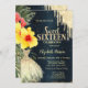 Elegant guld, guld glitter, hibiscus och handflatan löv på mörk blått grund.