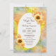 En elegant, rustik hög te inbjudningskort för möhippan med blommigt solrosdesign på en vibrerande gyllene bakgrund.