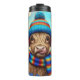 This is a delightful and humorous winter-themed sublimation design centered on a charming Highland cow calf. The cow, with its characteristic long fringe covering its eyes, is dressed warmly in a brightly colored, striped knitted beanie with a pom-pom and a matching vibrant striped scarf. The calf is depicted sticking its tongue out playfully, adding a touch of whimsy.