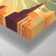 With its flattened perspective, simplified forms, and vibrant palette of burnt oranges, muted golds, and cool blues, the artwork channels the optimism of Art Deco and the grandeur of WPA-era futurism. Stylized clouds drift past, grounding the idealism in a dreamlike realism.