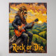 Denna dynamiska grafik visar en lejon, tittar coola i solglasögon och i läder jacka, mästerligt "sönderdelad" och en elektrisk gitarr när den genomborras på sten. Situationen breder ut sig över den rullande grönten backe och avlägset träd under ett stort och fruktansvärt solnedgång i himmel. Den tjocka, uttryckliga impaston skapar ett påtagligt struktur, skapar "Sten eller Die"-deklarationen som svarar mot prestandans råenergi.