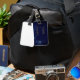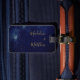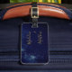Guld, som ge intryck av stjärnor i himmel, skiner ovanför ord på blå bakgrund. Ett modernt tema för en bagagetagg i personligt bröllp på kvällen snyggt. Ändra enkelt informationen till ditt eget anpassad design.