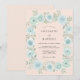 Denna design har en mjuk tvätt av blek aprikos som bakgrund för ett känsligt arrangemang av akvarellrosor. Blommorna är renderade i en ljus akvablå nyans, kompletterade med dämpade salvia gröna blad och stjälkar. Den övergripande estetiken är romantisk och luftig, som frammanar en lugn vår morgon atmosfär. Denna botaniska komposition skapar en fredlig och elegant visuell för en säsongsbetonad ceremoni.