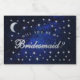 Ett himmelskt förslag till brudtärna. Den har silvergrå text mot en marinblå himmelbakgrund, med falska silverstjärnor och måne. Ordet Brudtärna (som är i falskt silverfolie) är skrivet med en elegant kalligrafisk stil, den välvda texten "vill du vara min" ovanför ordet Brudtärna med små bokstäver.